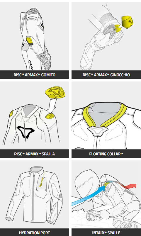 La nuovissima ventilazione Intair™ è presente sulle spalle. Questa parte solida tra il collo e la protezione esterna delle spalle garantisce un flusso d'aria costante per raffreddare il corpo dove di solito non c'è. Il suo Floating Collar™ è realizzato in morbido neoprene e non graffia il collo quando ci si muove. La gobba sulla schiena ha una porta di idratazione e la sua tasca interna si apre facilmente grazie al Quick Access Puller™. Le ginocchia hanno dei grip in TPR simile alla gomma per una migliore sensazione con la moto e sono inclusi dei ginocchiere.